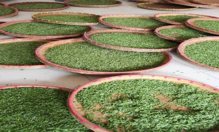 要求低温高湿,薄摊长放;场地环境要求洁净、干燥、防止污染、清洁通风、阴凉,室温要求在20-25度,相对湿度为70%;低温环境下,有利于茶叶内含物质品质转化,适当提高湿度,有利于肥壮芽叶的适度摊放,保持芽叶内外均匀一致;鲜叶采摘回来后,应及时的分级别,然后摊放在竹帘上,厚度要求2-3厘米,摊放时间4-5小时,等到茶叶失重5-8%,含水量约为72%的时候,即可进行杀青步骤了。