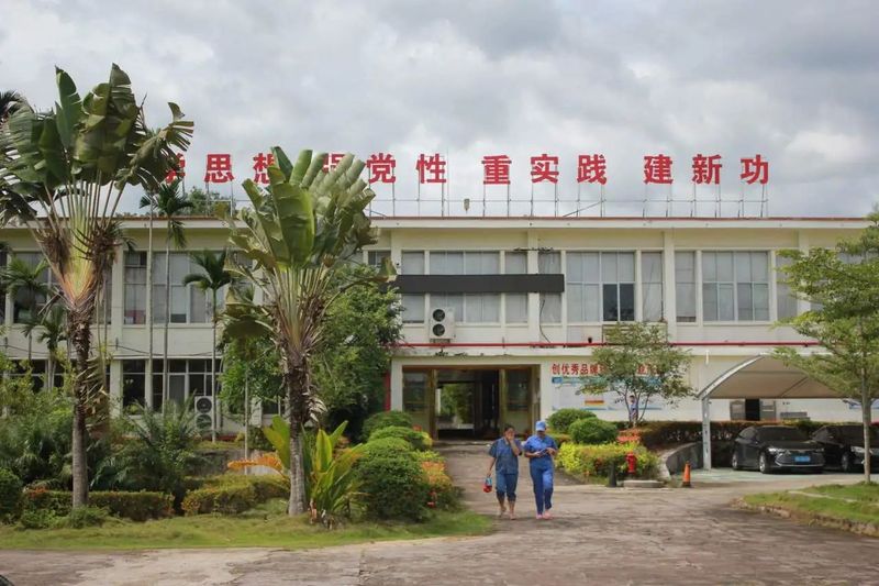 白沙茶业茶叶加工厂大门,一旁的非洲楝树见证了茶厂60年的历史