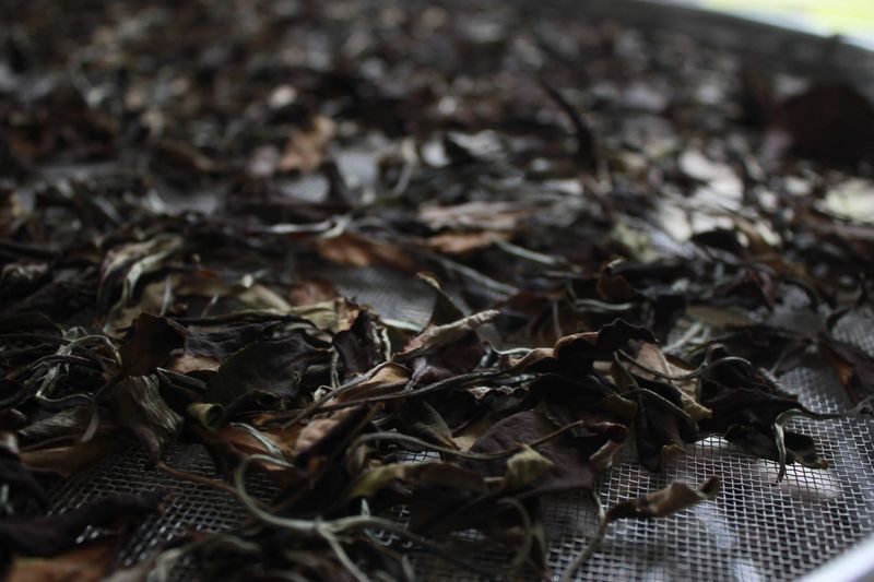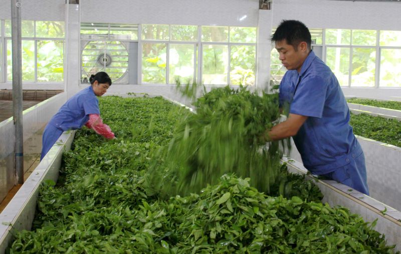 茶厂工人正给新采摘的茶青进行摊晾