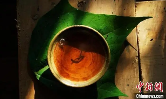 从火塘取几块烧红木炭,放到葫芦瓢中上下颠簸,待高温稍退和着茶叶拌炒,尚未焦煳之时捡出木炭,将茶倒入土罐煮沸,再用土碗装盛,茶水轻抿,满口回甘,瞬感宁静与放松……