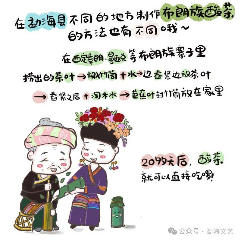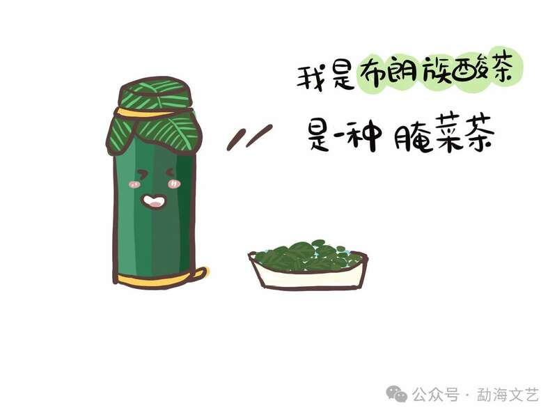 布朗族酸茶,又称为“腌酸茶”,主要流行于勐海县布朗族聚居的布朗山乡。酸茶不仅可以烹饪作为菜肴,也可用开水冲泡成为饮料,甚至可以作为零食直接咀嚼。
