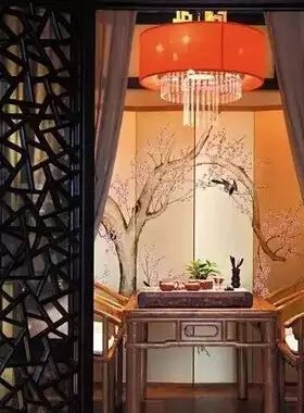 如果有一个独立的空间做茶室,是最好不过的了。哪怕是一个开放式的空间,也可以通过雕花的隔断和纱帘,让它变身为幽静的私人处所。小小的桌子,搭配古典的椅子,再摆放韵味十足的茶具,“喜上眉梢”寓意的屏风更增添几分闹意。放下纱帘,就成为冥想品茶的幽闭空间。