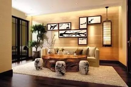 在现代居室中,取一方小空间作为茶室很难实现,可以将空间多功能化,一间休闲室也能兼具茶室的功能。木色墙壁上,黑白色的装饰画给人悠远的意境。白色沙发前摆放原木桌子,旁边放几个陶瓷凳,绘上竹梅古画,立刻有了古香古色的味道。