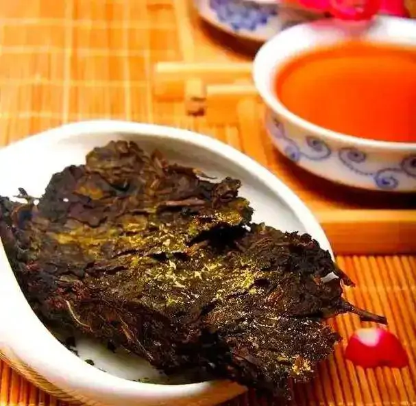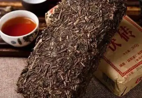 再次,看茶叶的外形。不同年代的茯茶茶叶,色泽也有所不同。新茯茶的茶砖表面有大量的金黄色颗粒,形似“米兰”。随着陈放年代的延长,色泽逐步萎缩变白,三十年的茯茶已基本见不到金花留下的痕迹,隐约可见白色欠均匀的斑点。