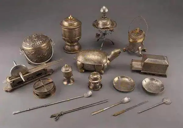 其中以唐代僖宗皇帝小名“五哥”标记的系列茶具最为珍贵,包括:鎏金飞鸿球路纹银笼子、壶门高圈足座银风炉、鎏金壶门座茶碾子、鎏金飞鸿纹银匙、鎏金仙人驾鹤纹壶门座茶罗子、鎏金人物画银坛子、摩羯纹蕾纽三足架银盐台、鎏金伎乐纹调达子、鎏金银龟盒,另有系链银火筋、琉璃茶盏、茶托等。