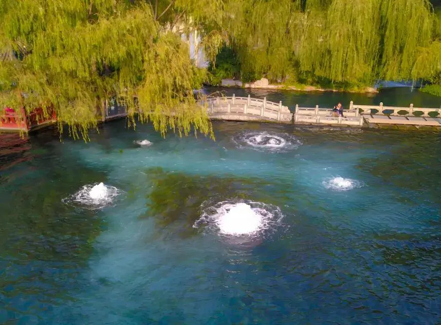 泉林之泉各具特色。趵突泉从石渎中涌出水面,“有若人之搏而涌激”,翻波作浪,汹涌激荡。黑虎泉犹如猛虎出峡谷,长啸怒号,声势浩荡,气概雄壮。珍珠泉“有若雾之散于水面”,泉池底不时涌出银白色的气泡,大小、形态变幻,恰如珍珠抛出明镜。红石泉“有若腥血之涂石者”,那是因为泉林一带多赤铁矿,其泉水从成矿矽卡岩裂隙带涌出,远远望去,就像一潭碧血,景色十分奇特。双睛泉从石壁之两个圆洞中喷出,真像一双晶莹明亮的眼睛。雪花泉中浪花翻滚,远映近绕,如流烟相灌激,似翻云之成堆,不以雨而盈,不以旱而涸。
