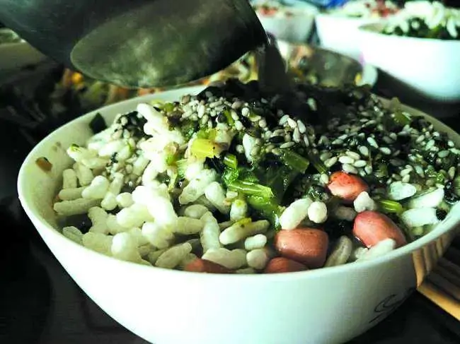 今天的咸茶中的佐料,竟有二十几样之多,包括橙子皮、野芝麻、烘青豆、豆腐干、蚕豆瓣、黄豆芽、笋干、胡萝卜、香薯干、橄榄、酱瓜、花生米、卤桂花等等。听上去五花八门,看起来眼花缭乱,而吃起来则香喷喷,咸津津,风味绝佳。
