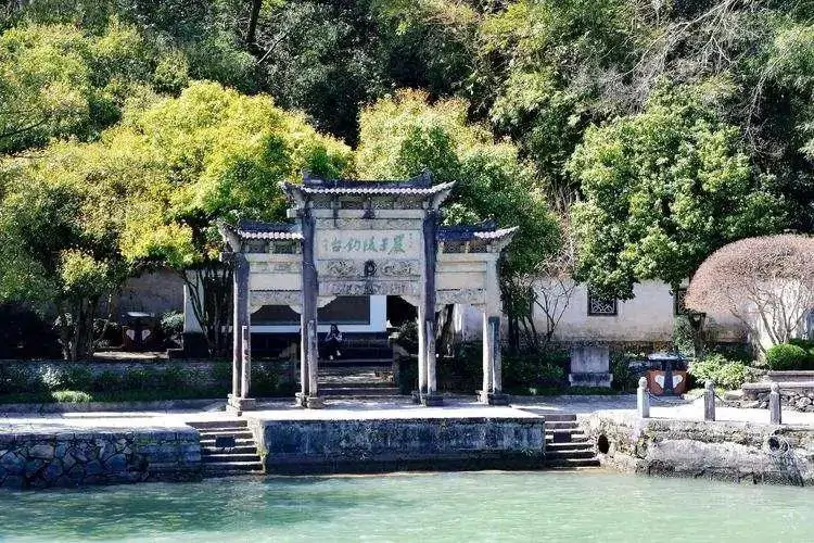 严子陵滩水,位于浙江桐庐县城西富春山下的富春江边。富春山在半山腰处,有两块大磐石,屹立东西两岸。东为严光钓台,西为谢翱台。严光,即严子陵,东汉初会稽余姚(今属浙江省)人,因不愿为仕,隐居富春山,常在富春江畔垂钓。后垂钓之处建成严陵钓台。谢翱,字皋羽,南宋长溪(今属福建福安市)人,为抗金名将文天祥咨事参军,文天祥兵败被害,谢翱在严子陵钓台设灵位以祭,还登西台哭奠。如今,在东西两台各有石亭一座,临江还有建于北宋景祐年间(1034-1037)的严先生祠;祠前,竖有历代碑记。