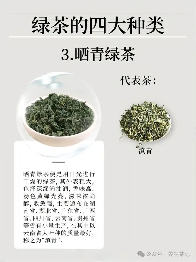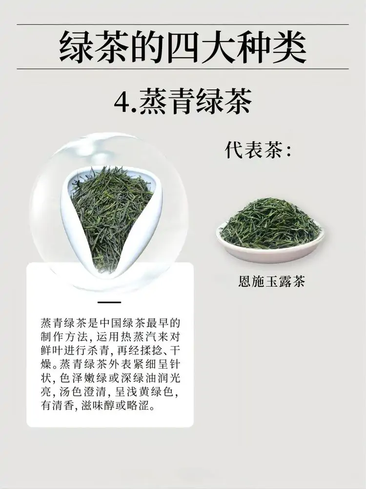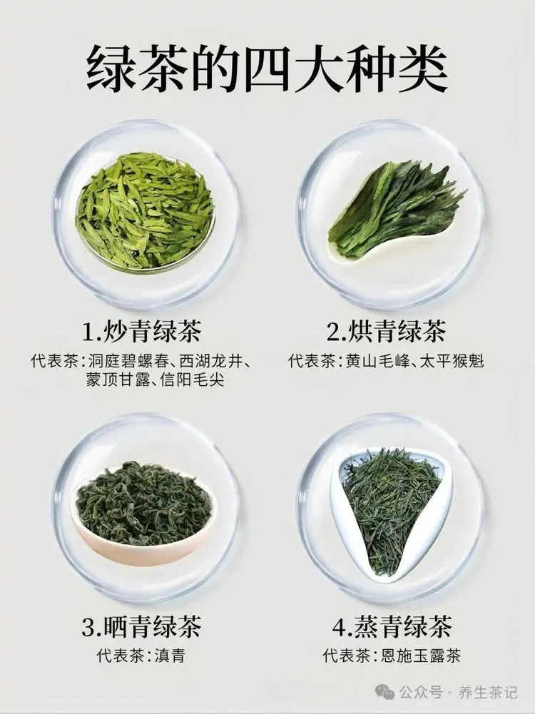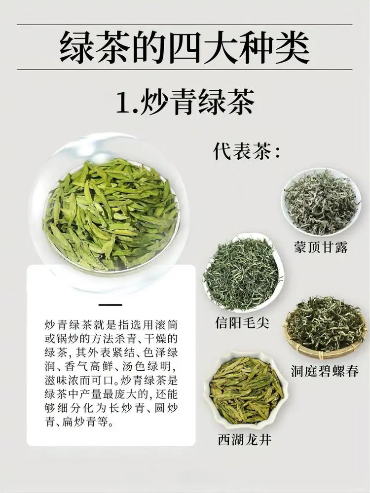 绿茶根据杀青和干燥方式的不同,可分为以下四大种类: