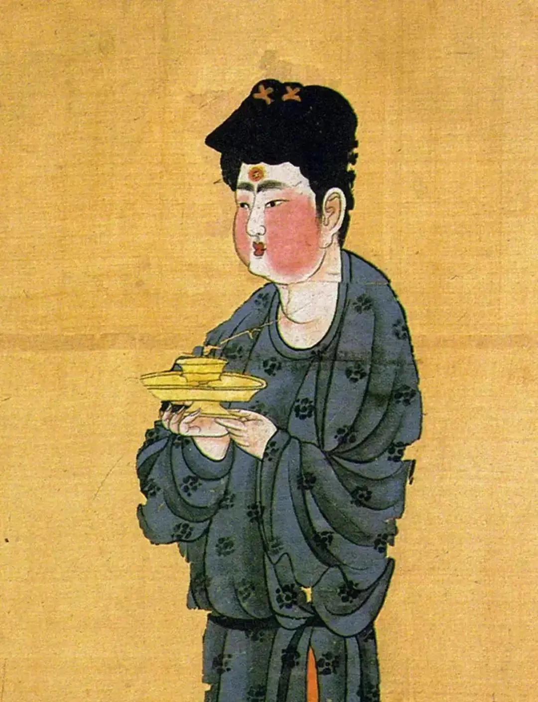 (唐,佚名,弈棋侍女图局部,纵81.4厘米,新疆维吾尔自治区博物馆藏),画面以弈棋贵妇为中心人物,围绕弈棋又有侍婢应候、儿童嬉戏等内容,反映了唐代西域女子充满闲情逸致的休闲娱乐生活。其中,《托盏侍女图》是《弈棋仕女图》的一部分,图中的奉茶侍女,头梳丫鬟髻,额间装饰花钿,身着蓝色印花圆领长袍,双手托盏,小心翼翼地将茶盏托于右手掌上。茶盏由茶托与茶杯组合而成,茶托为高足盘形,茶杯置于茶托的中央部位。从绢画中不好确定茶盏的质地,有可能是釉陶、器或木制。表现了侍女为弈棋的主人进茶的情景。