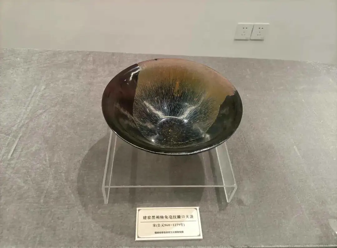 建盏釉色绀黑如漆,内敛含蓄,令人在赏玩时会顿生一种深邃寂寥之感,而釉面上错落散布的结晶斑点,似闪烁在幽邃渺远太空中的繁星。它给人带来的审美体验,与日本传统美学中的"幽玄""侘寂"之美隐隐相合,有4件传世宋朝建盏(3件曜变盏,1件油滴盏)被日本奉为"国宝"。建盏与日本茶道,产生了美的共鸣,我们至今还能从日本茶道中看到宋朝美学精神的遗存。