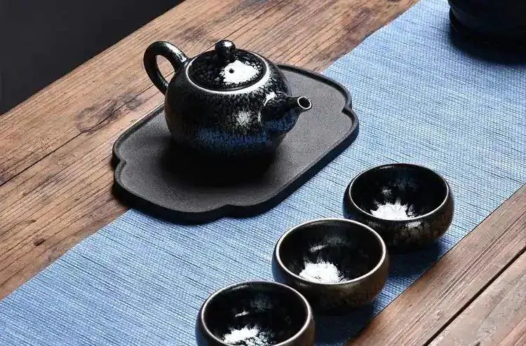 黑瓷茶具,产于浙江、四川、福建等地,宋代斗茶之风盛行,福建(古时称建安)所产的茶盏颜色绀黑,古朴雅致,瓷制厚重,保温性能好,适合斗茶而驰名。