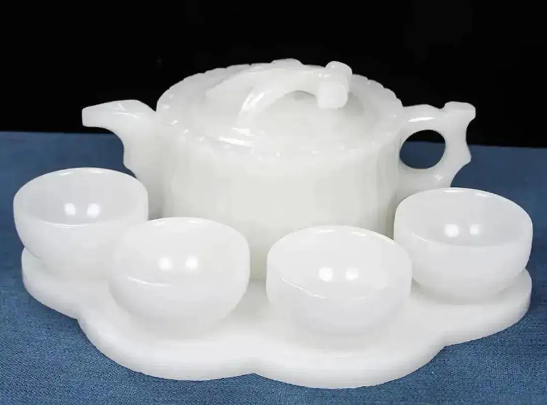 玉石茶具是用玉石雕刻而成的茶器,质地细腻光滑,温润有形,且造价昂贵,传热保温效果一般,它更多的时候作为饮茶文化的一种艺术藏品,在生活中很少使用。
