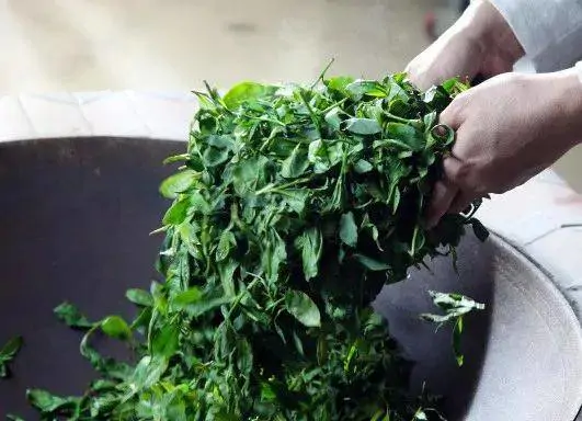炒青:即杀青。炒青要及时,当做青叶青草味消失,香气初露即应抓紧进行炒青。
