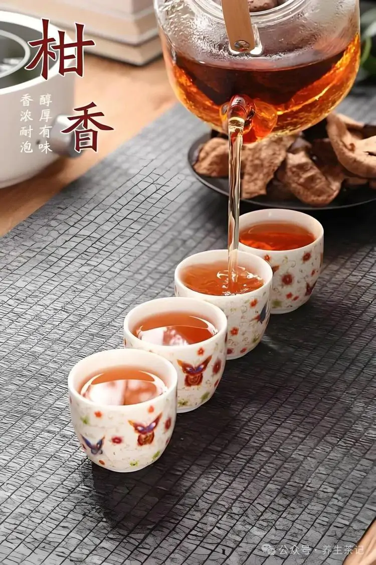 普洱茶以其降脂减肥、暖胃护胃的功效闻名,与陈皮搭配,更是相得益彰。陈皮的香气能提升普洱茶的口感,而普洱茶的醇厚则能衬托出陈皮的清新。两者结合,既能消食解腻,又能调节体内脂肪代谢,是秋冬季节理想的茶饮选择。