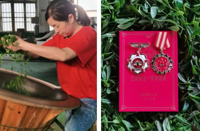 期间,邬淑芳还专门前往中国农科院茶叶研究所学习茶艺和评茶师专业知识,去祁门、东至红茶产区学习制茶经验和技术。几年的艰辛钻研,换来了她制茶技艺的突飞猛进,如今她已经是高级茶艺师、高级评茶师,从2012年起一直担任景德镇市金桂园农业开发有限公司生产技术员,2019年9月被命名为市级非遗项目浮梁工夫红茶制作技艺代表性传承人,先后获得江西省技术能手、江西省巾帼建功标兵、景德镇市技术能手、“浮梁工匠”等荣誉称号,并于2022年获景德镇市五一劳动奖章。