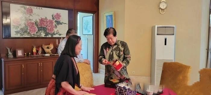 吴志斌(右)在雅加达向印尼华侨介绍祁门红茶 受访者供图
