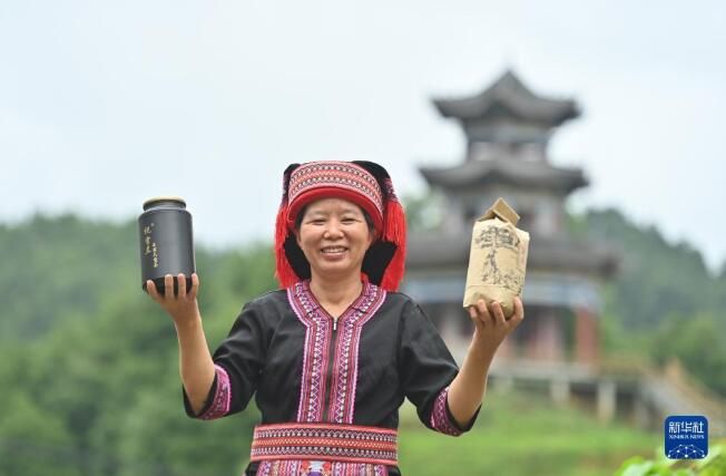 6月7日,在苍梧县六堡镇山坪村,祝雪兰在展示自己制作的六堡茶。