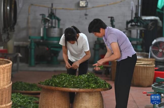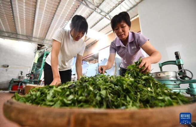 6月7日,在苍梧县六堡镇山坪村,祝雪兰(右)在制茶。