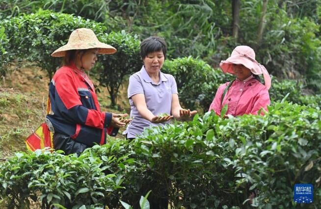 6月7日,在苍梧县六堡镇山坪村,祝雪兰(中)和村民们在采茶。