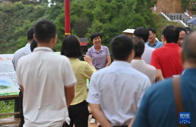 6月7日,在苍梧县六堡镇山坪村,祝雪兰向来访者介绍六堡茶文化和茶产业发展情况。