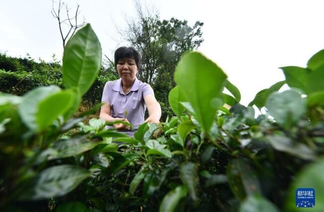 6月7日,在苍梧县六堡镇山坪村,祝雪兰在采茶。
