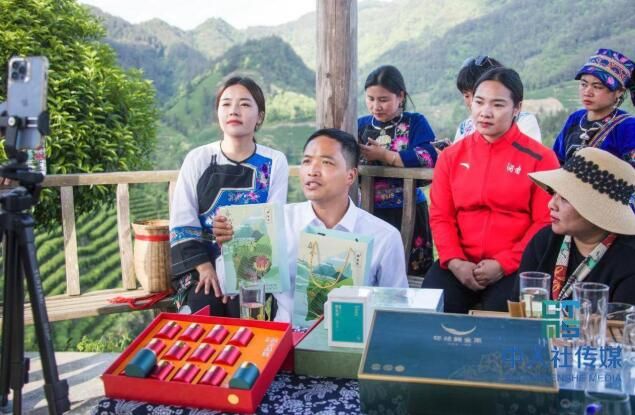 刘文武(左二)与奥运冠军杨霞、向艳梅及湘西州网红网络直播推介保靖黄金茶。