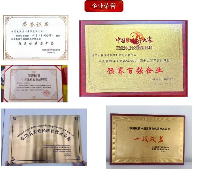 绿水青山就是金山银山、冰天雪地也是金山银山。林芝毛尖茶园经高山雪水浇灌,得冰川雪野之灵气,受充沛阳光之沐,极纯极净属实雪域之健康茶。独特珍稀的原料运用先进制茶工艺,制作而成的林芝毛尖干茶外形细圆光直,条形完整,色泽翠绿,略带白毫;汤色橙黄明亮,汤感绵柔,水中兰花香明显,味醇回甘;舒展后的叶底明亮鲜活,呈均匀的翠绿色,实为茶中臻品,显示出雪域高原茶叶天然优异的特质。企业于2022年12月被评为市级农业产业化龙头企业;林芝毛尖和雪域金眉在2021中国深圳(第7届)国际现代绿色农业博览会上被评为“优质农品金奖”,在2022年11月份广州全国首届茶王争霸赛被评为“百强企业”。2022年12月成都第十九届国际农产品交易会和2022年第十八届深圳文化产业博览会获得一致好评,在2023年5月上海第十九届国际茶业交易博览会红茶、绿茶双获金奖,在杭州第五届中国国际茶叶博览会荣获“推荐优秀茶产品”,在北京第30届健博会特授予“中国优质农业品牌奖”。公司坚持做“产业+文旅”已成为现代生活中不可或缺的体验方式,借助219国道沿线的阿扎冰川、梅里雪山、僜人部落、桃花村、赛马节等旅游资源与林芝毛尖深度融合发展,让游客既能领略察隅独有美景、体验察隅天然农业,又能促进产业发展、群众致富。
