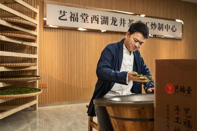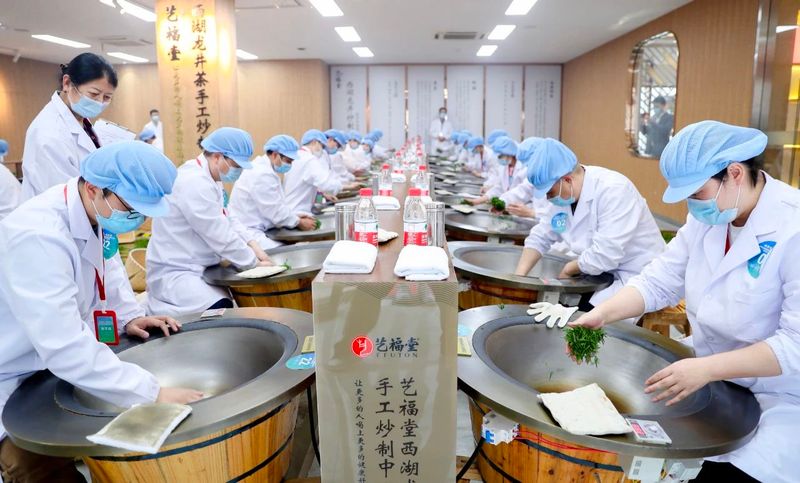 “左右捣凝膏,朝昏布烟缕。方圆随样拍,次第依层取。山谣纵高下,火候还文武。见说焙前人,时时炙花脯。”早在唐代,诗人陆龟蒙就已详细写明了焙茶时的技巧手法。沧海桑田,秉承着守护传统制茶工艺的初心,李晓军带领团队建立了艺福堂西湖龙井茶手工炒制中心,定期开展西湖龙井茶手工炒制集训活动,帮助茶农提升手工炒茶技艺;连续多年参与举办龙井茶手工炒制比赛,促进龙井茶手工炒制技艺的传承和发扬。