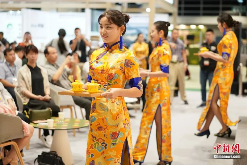 2018年8月,来自江苏的茶艺表演者在香港第10届国际茶展上表演茶艺“金玉茶缘”。张炜摄