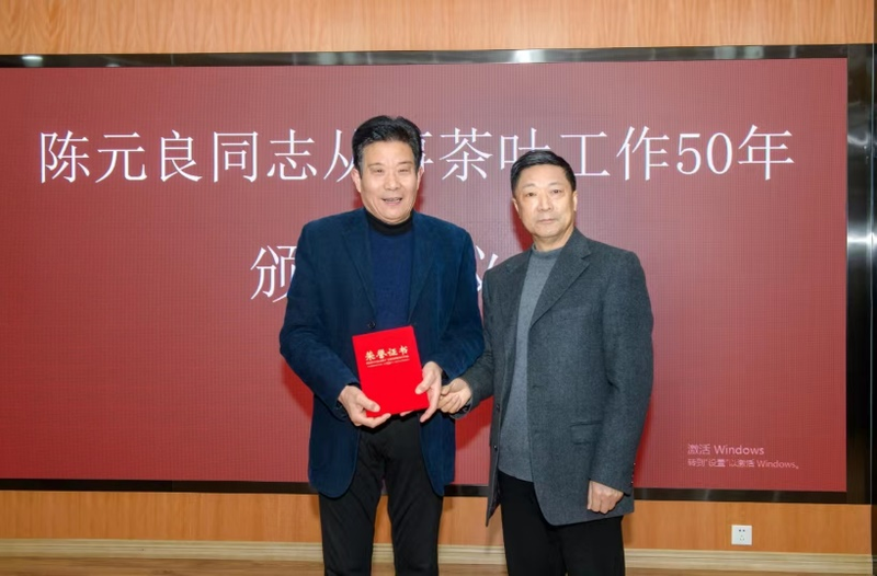 近日,在诸暨市茶文化研究会举行的二届六次理事会上,诸暨市老茶人陈元良收到了研究会会长张振华亲自颁发的“从事茶叶工作50年荣誉证书”。张会长说:“ 我们专门举行仪式颁发此证,主要为了表彰他从业50年来为诸暨市茶文化发展作出的贡献。希望一代代的诸暨茶人,能以陈元良为标杆,扎根暨阳大地,高质量发展本土茶产业。”