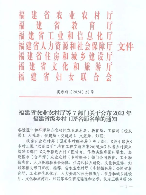 近日,福建省农业农村厅公布了2023年福建省级乡村工匠名师遴选结果,三明市三八红旗手、妇女代表,尤溪县沈熹茶叶专业合作社“妇女微家”微家长——林秀娟被认定为福建省级乡村工匠名师。