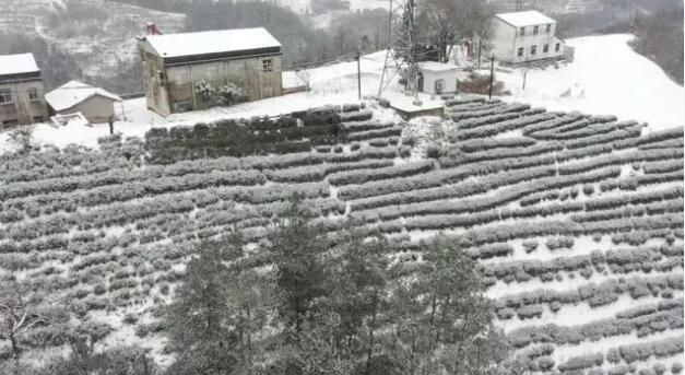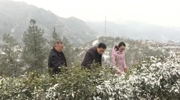 2月21日,在保康县土门村朝阳观茶园内,保康县农业技术推广中心的技术专家们正迎风冒雪指导茶农及时清除茶树上的积雪,科学应对雨雪冰冻天气。