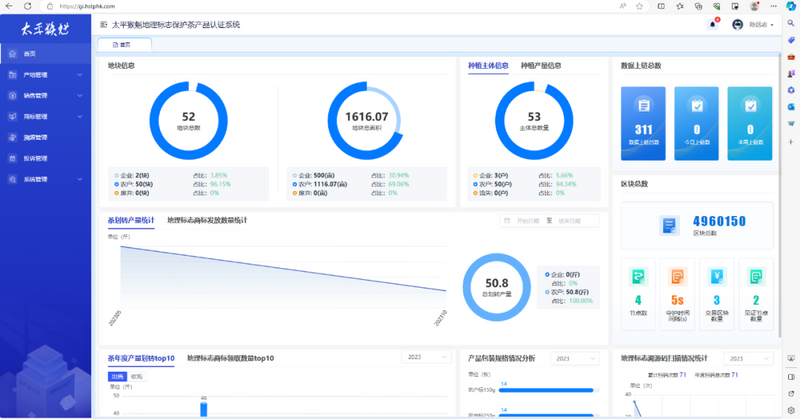 太平猴魁地理标志保护茶产品认证管理后台集产地管理、地块管理、销售管理、商标管理、溯源管理、设备管理、投诉管理、系统管理等多种功能于一体,实现了太平猴魁从种植到生产再到销售的全流程、全方位监管。其中,产地管理功能可以同时管理产地、地块、种植主体等信息,而销售管理系统会给企业(农户)自动发放核定的产量,企业(农户)可以在系统中进行茶叶产量的划转销售,销售完成后可根据账号中拥有的太平猴魁茶产品产量兑换商标。