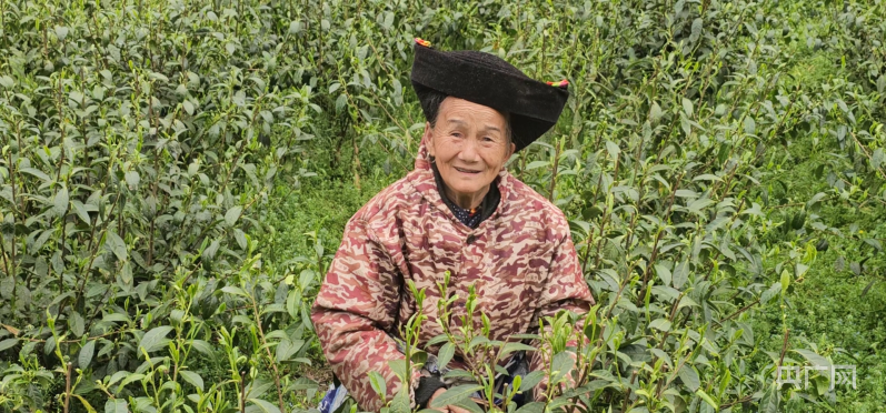 坪年村苗族阿婆在采摘黄金茶(央广网记者张志诚 摄)