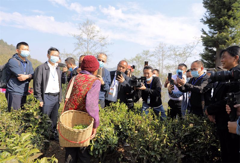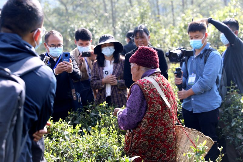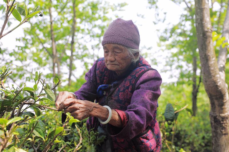 “草木蔓发,春山可望”。人与茶的关系,除了人的口啼好与茶原真之味的相互吸引,更有一份感情的羁绊。每一次弯腰,既是动作也是姿态;每一次伸手,既是获取也是交流。如今,已到耄耋之年的李翠兰依旧身强体健,家里的20余亩茶园80%由她自己采摘。采茶时,她习惯性含着一片鲜叶解渴,看到记者前来采访,她停下手里的工作笑着说,“现在生活越来越好,我也要多活几年,把茶种的更好。”