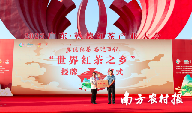 中国茶叶流通协会党支部副书记、副会长姚静波受国际茶叶委员会委托向英德颁发了 “世界红茶之乡”牌匾