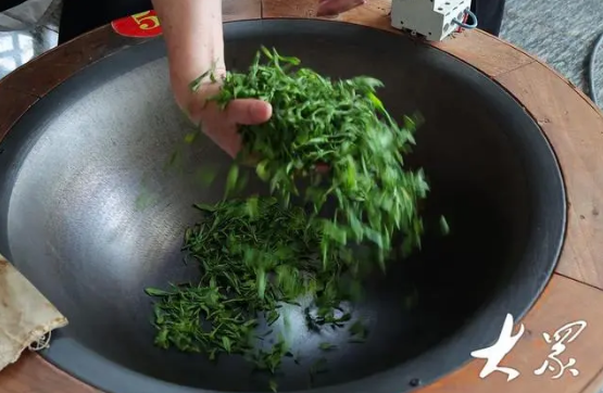 铁锅的温度逐渐上升到260°C左右,拿棉布擦拭,表面已经开始冒出丝丝白烟,手离锅面10cm左右的距离,就能感受到灼人的热气不断上涌,使人不敢再靠近一分,这时就要投入摊晾好的鲜叶了。鲜叶下锅时是翠绿色,接触铁锅的一瞬间,高温与水汽相互作用,发出噼啪的响声,空气中有了清新的叶有香。