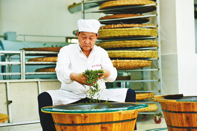 ▲康联龙向学徒传授手工炒茶经验。汤江摄