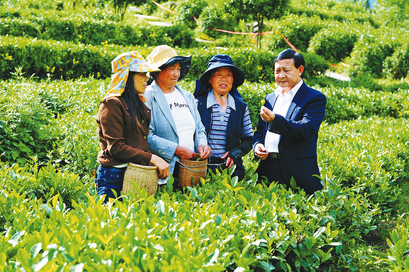 ▲康联龙向茶农讲解茶叶采摘叶形标准。刘俊强摄
