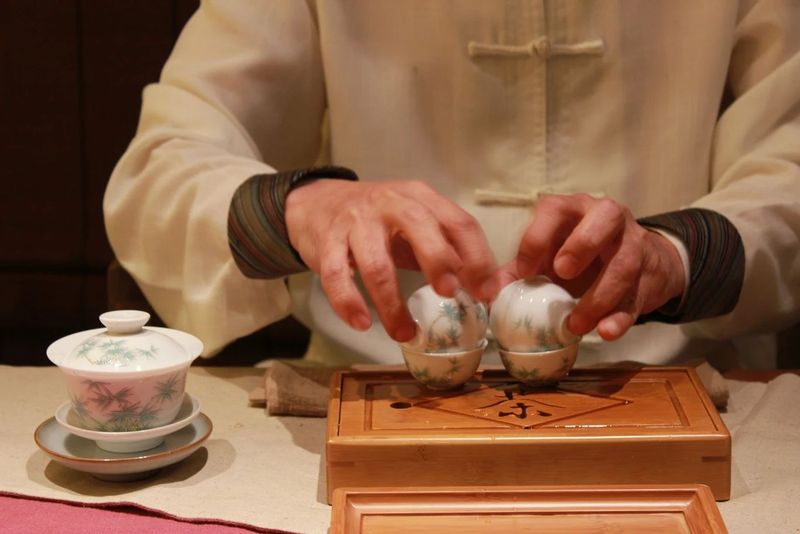 △工夫茶茶艺中的洗杯,转动杯身时动作如同飞轮旋转