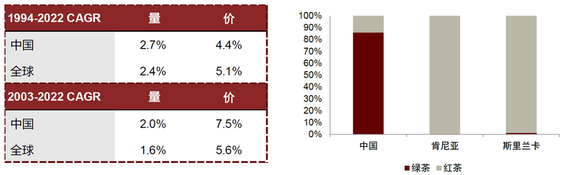 我国茶叶出口金额仅占内销4%,1994-2023年CAGR为6.3%,以价格驱动为主。2023年我国茶叶出口金额为17.4亿美元,仅占内销的3.6%,1994-2023年我国茶叶出口金额的CAGR为6.3%,量、价CAGR分别2.7%和4.4%,以价格驱动为主。