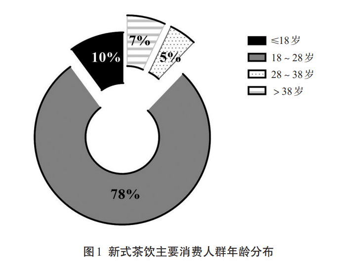 2. 市场驱动因素(1)年轻群体的消费习惯新式茶饮市场在不同年龄段消费群体中呈现出不均衡的扩张模式。针对全体新式茶饮消费者,本研究基于对新式茶饮消费者情况的调查,通过对203份有效匿名调查问卷进行分析,其中男性占27.59%,女性占72.41%。数据表明,新式茶饮市场的消费者主要为28岁及以下的群体,大于28岁的人群仅占总数的12%(图1)。表明与传统原叶茶的中老年消费群体相比,年轻群体对新式茶饮的消费意愿更高。原因可能是传统茶饮在满足年轻人特定的口感、冲泡便捷性和携带方面的需求存在局限。研究表明,年轻群体对饮品的便利程度要求较高,同时在口感方面表现较高的挑剔性。这暗示了针对年轻消费群体进行的配方设计与产品创新可能与积极的市场反应存在关联性。新式茶饮的多样化体验与青年一代多元的娱乐和生活方式相契合,表现出市场为适应目标客户更高层次消费需求做出了策略性响应。