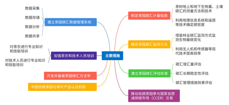 1. 完善茶园碳汇计量、监测和评估体系,制定详细的茶园碳汇计量指南。包括茶树地上和地下生物量、土壤等碳汇的测量方法和技术,同时可以使用现代技术,比如地理信息系统(GIS)和遥感来确定茶园的碳密度,并结合实地测量来验证模型的准确性,进而确定碳汇量。