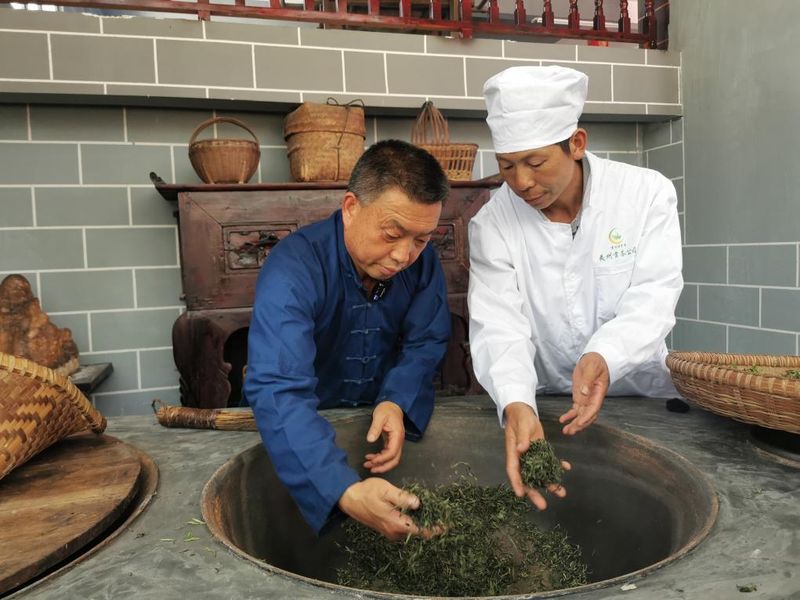 王飞(左)与村民交流手工制茶技艺。(孙伟 摄)