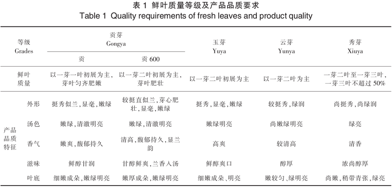 原料是品质形成的基础,在《西施石笕茶》团体标准中对鲜叶原料进行了规范,要求鲜叶芽叶完整,色泽鲜绿,匀整,无劣变,不带茶蒂、茶果。用于同批次加工的鲜叶,其嫩度、匀度、净度、新鲜度应基本一致。鲜叶按质量分为贡芽(贡、贡600)、玉芽、云芽、秀芽,鲜叶质量分级与产品分级保持一致,有利于加强标准使用者对产品等级的理解和规范。鲜叶质量要求如表1所示,开采标准为一芽一叶初展,芽长于叶,符合传统采摘要求。