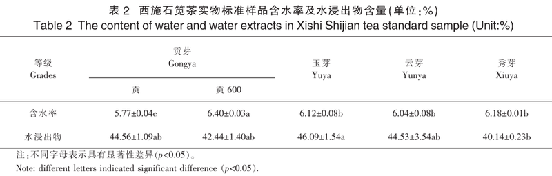《西施石笕茶》(T/ZTXH-002-2023)团体标准中对西施石笕茶产品的理化指标、安全指标及净含量等方面进行了规范。产品水分、总灰分、水浸出物以及粉末含量不仅要求出厂时需要符合规定要求,并且要求在运输、贮存、货架放置等整个保质期内都需达到标准指标的要求。理化指标中水分和水浸出物含量与产品品质特征密切相关,对西施石笕茶实物标准样品的含水率和水浸出物含量进行检测,结果如表2所示,不同等级西施石笕茶产品含水率均符合标准中对产品水分的要求(≤6.5%)。茶叶含水率直接关系到茶叶品质,尤其是在贮运销售过程中的品质变化,较低的含水率能够延长茶叶品质的保持时间,而茶叶中水分含量超过10%时,茶叶会发霉变质、失去饮用价值。