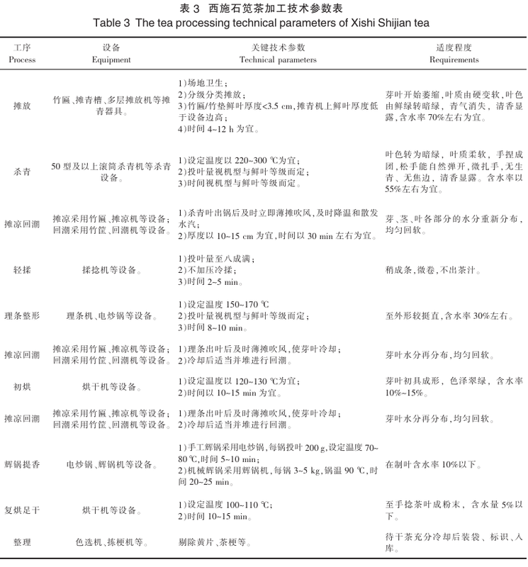 摊放是名优绿茶加工的首要步骤,名优茶摊放叶含水率一般在68%~70%。西施石笕茶生产规模相对较小,普遍采用竹匾或摊青槽进行鲜叶摊放,摊放时要求场地清洁卫生、空气流通、无异味;鲜叶进厂后分级分类摊放,竹匾摊放鲜叶厚度3.5 cm以下;摊放时间以4~12 h为宜,过程中鲜叶水分缓慢散失,直至叶质由硬变软,叶色由鲜绿转暗绿,青气消失,清香显露。