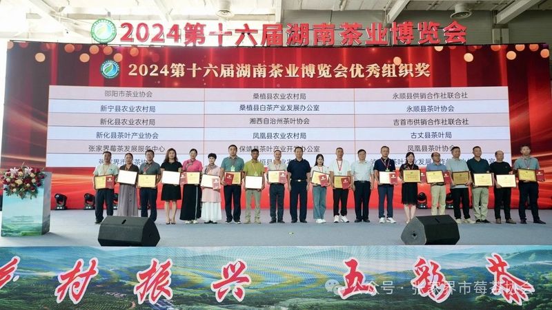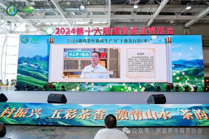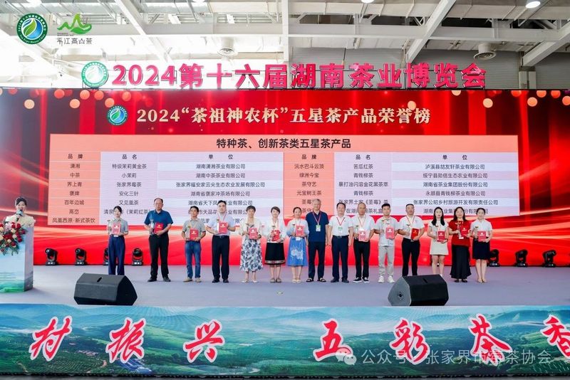 开幕式上,张家界市永定区被授予2024湖南茶叶新质生产力“十强先行县(市)”荣誉称号;同日下午举行的2024第十六届湖南茶业博览会“茶祖神农杯“五星茶产品暨优秀组织奖颁奖典礼中,张家界福安家云尖生态农业发展有限公司旗下品牌“界上青”、张家界公昭乡村旅游开发有限责任公司旗下品牌“圣莓茶”以其卓越品质双双获评“特种茶与创新茶类五星茶产品”称号;张家界莓茶发展服务中心、张家界市莓茶协会被评为优秀组织奖。