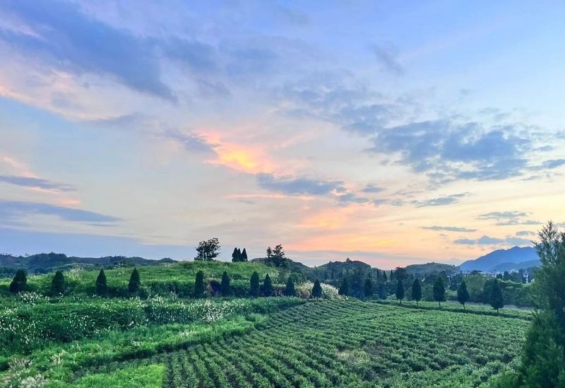 漫步于茶田之间,会感觉整个人都沉浸在清新的茶香之中。这种香味沁人心脾,混合着雨后潮湿的气息,如品茶一般,刚开始有淡淡的苦涩,回味之时却尽是芬芳雅致。一棵棵茶树紧挨在一起,枝干并不高大,却略粗壮。顶上的枝条向四周蓬勃伸展,像是给低矮的茶树撑开一把翠绿的大伞。